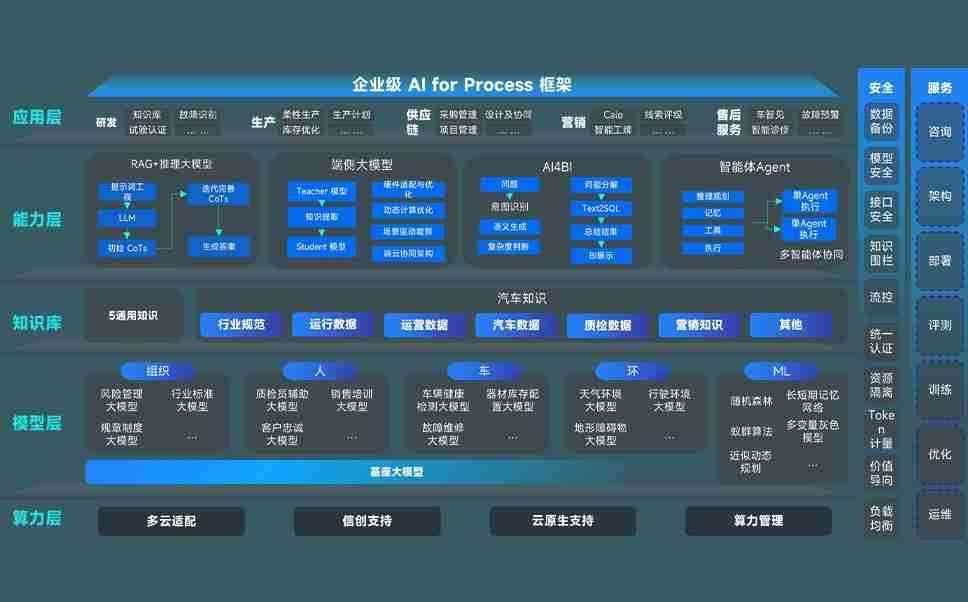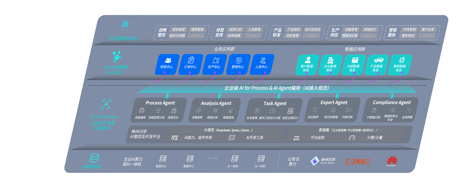 端到端的一站式AI工作空间深度融合了从企业战略规划到日常经营的全流程业务板块,,,,定向解决车企内部领域多、、、、部门多、、、、链条长、、、场景碎片化等难题,,支持车企快速构建以AI为核心的生产力写作体系,,,,实现任务执行与AI能力的无缝集成与交互
