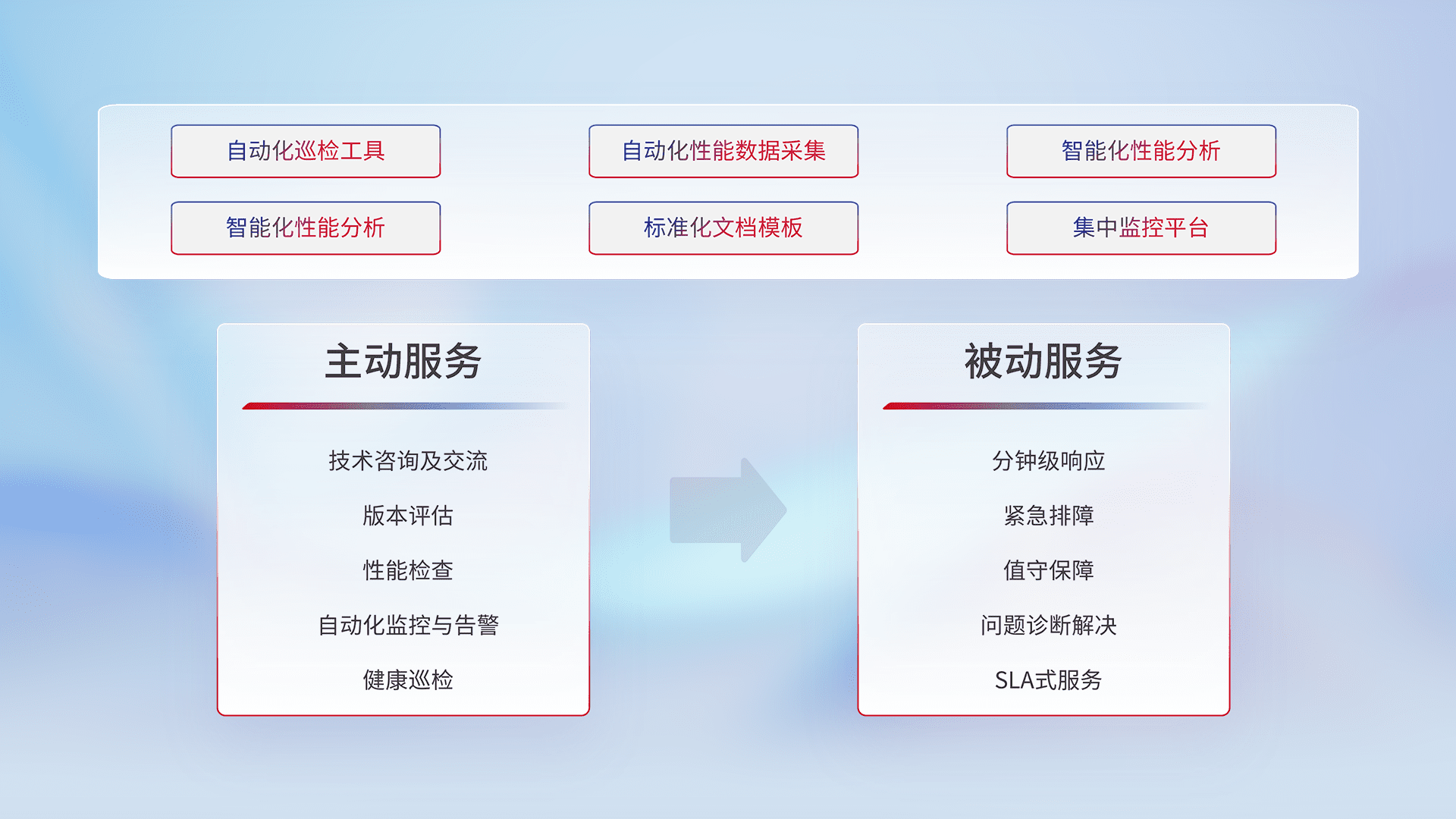 智能化工具和标准化文档,,,保障服务质量,,,,提供主动服务(包含技术咨询、、、、版本评估、、性能检查、、、自动化监控与告警、、、健康巡检)和被动服务包含(分钟级响应、、、紧急排障、、、值守保障、、问题诊断解决、、、SLA服务)。。。